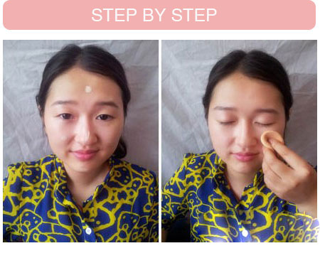 STEP 1:选择较为轻薄的粉底液,先抹在脸颊、额头、鼻子尖儿、下巴5点处,之后用一块微微湿润的海绵油内往外推均匀,然后用散粉定妆