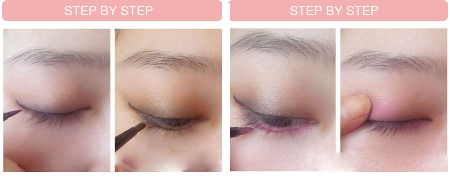 STEP 6:谁说单眼皮不适合用粉色眼影?怕显得眼部浮肿的话,把粉色放在下眼睑上吧,用粉色眼影或者眼线笔叠加在下眼线上,为了和下眼睑呼应,可以用指腹把一点粉色眼影按压在上眼睑上,让上眼皮有点淡淡的颜色即可。