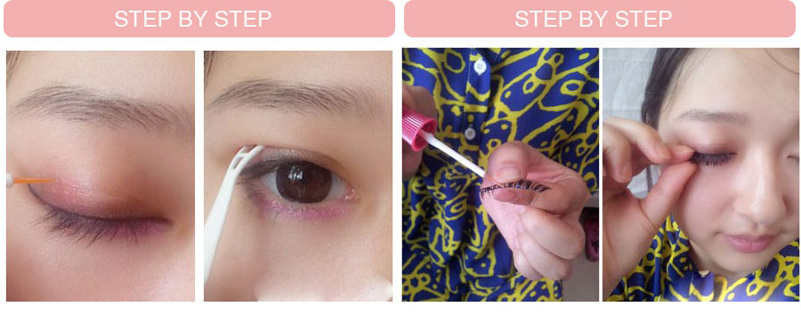 STEP 7:用双眼皮贴总是不够隐形,这里可以用双眼皮胶涂抹在上眼睑处,待眼线半透明状后,用双眼皮支撑叉固定于上眼睑中间,使其平整,就可以出现自然美的双眼皮效果哦,当然这步是可以省略的。