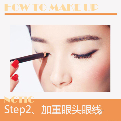 内双眼睛在睁开后,眼角睫毛根部眼线会被眼皮褶皱遮盖,所以眼角眼线要特别加重,宽度也比眼睛中间部分的眼线略宽。