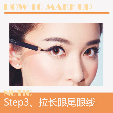 用眼线笔顺着睫毛的根部将眼尾处的眼线平行拉长,拉伸长度根据眼形的不同,可在1~2mm之间进行调整。然后,从眼线上边缘自然过渡至尾端。