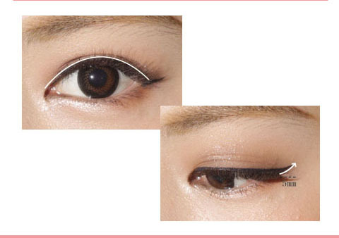 完成眼线后,在眼尾部分向外侧延长5mm,打造微上扬的眼尾眼线。