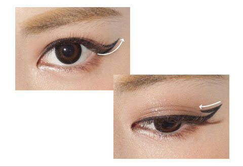平常的性感猫眼已经看腻了?小编今天介绍的性感猫眼却是有点小创新,在眼线的顶端向回沿双眼皮平行描画,打造出中空的感觉,非常特别。