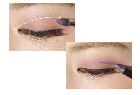 选择同色系的彩色眼线笔,在双眼皮线上再次进行描画。