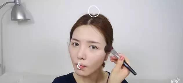 第五步打阴影。用棕色的阴影粉打在耳根到下巴的连线上。把嘴嘟成“鱼嘴型”,在颧骨下方凹进去的部分扫上阴影粉。