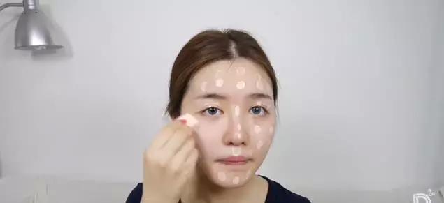 第二步涂粉底。将粉底点在全脸,用海绵均匀涂开。