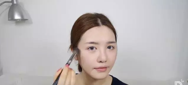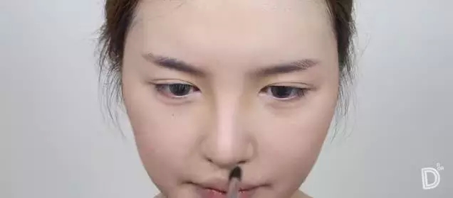 第七步打鼻影。用棕色的眼影棒涂在眉头,然后用刷子向下扫开,一直刷到鼻头,自然晕开。