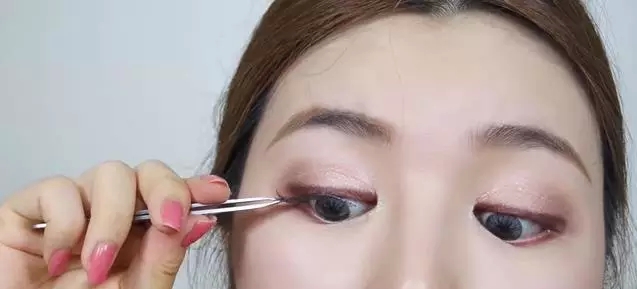 第十一步睫毛。先贴假睫毛,眼睛向下看把假睫毛贴在睫毛根部。顺序是:眼中,眼尾,眼角。